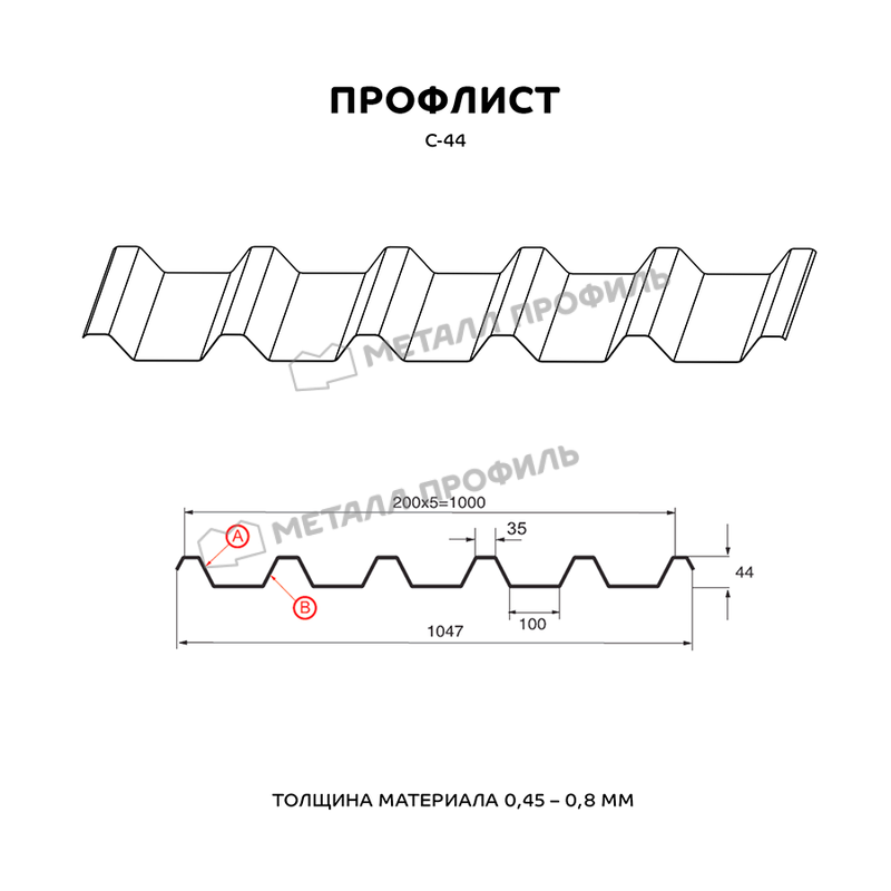 Профлист изготовлен из металла толщиной 0.7 мм, что обеспечивает ему прочность и долговечность. Он имеет форму С-44, которая обеспечивает хорошую жесткость и устойчивость к нагрузкам.