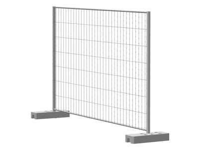 Панель выполнена из горячеоцинкованных прутков диаметром 3,0 мм. Для возведения ограждения необходимо расставить бетонные основания, установить готовые секции и скрепить их между собой креплениями временных ограждений.